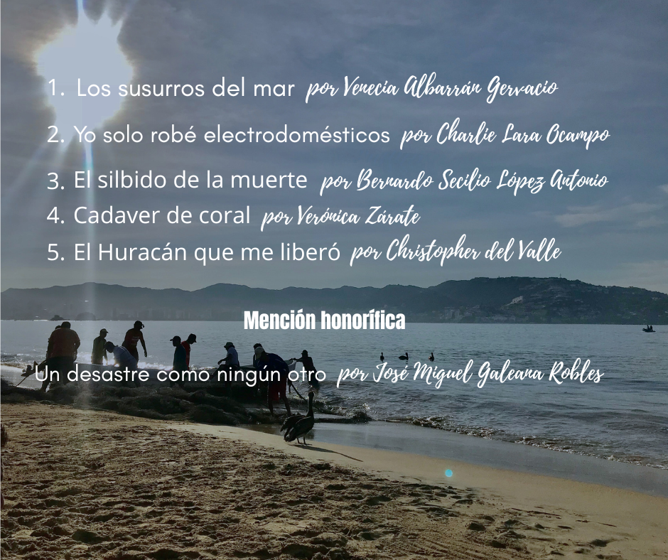 Los susurros del mar, por registrar desde lo onírico la vida de mujeres y hombres de mar que, en cada tormenta y huracán se enfrentan con la muerte; Yo solo robé electrodomésticos, al ser un trabajo que narra la tensión que obliga al personaje a decidir entre cumplir con su obligación laboral o aprovechar el momento para apropiarse de objetos inalcanzables, en un paisaje devastador; El silbido de la muerte, por ser el trepidante viaje de un joven por los usos y costumbres de la geografía sureña que lo mismo muestra su belleza, a través de un lírico lenguaje, que el poder devastador de su propia naturaleza; Cadáver coral, que es un texto testimonial de alta potencia sensorial, donde la experiencia íntima del huracán Otis en Acapulco se despliega como una crónica poética del desastre.