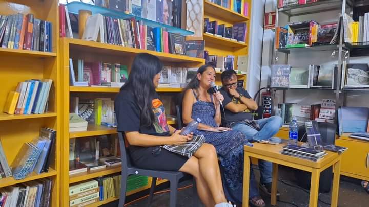 Flor Venalonso Neri, Citlali Guerrero y Charlie Feroz durante la primera presentación de Conversaciones con el cadáver de mi madre, en la librería Educal Chilpancingo.